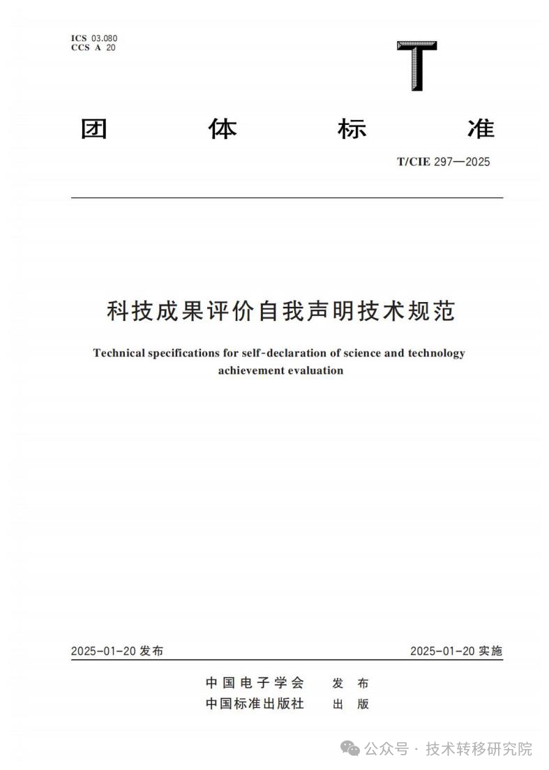 近日,我國科技成果評價領域自我聲明團體標準《科技成果評價自我聲明技術規范》(T/CIE 297 - 2025)正式發布。