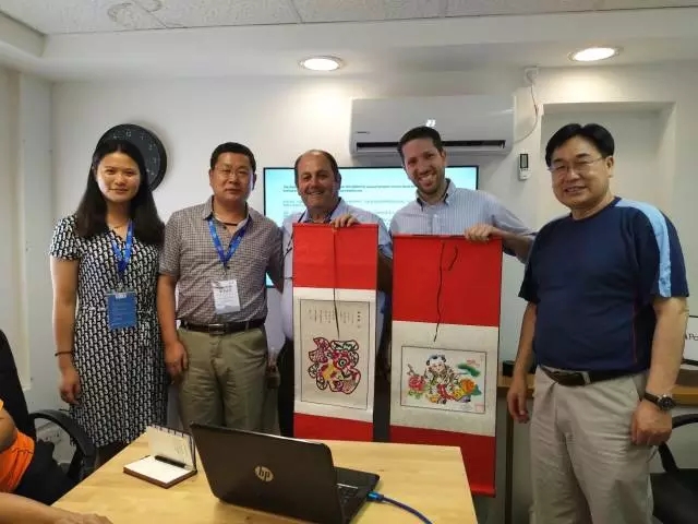參觀交流結束后,考察團班長(右一)中國文化辦公設備制造行業協會副理事長焦延和、副班長(左二)中國儀器儀表行業協會分析儀器分會秘書長曾偉向以方企業贈送具有中國特色的禮物
