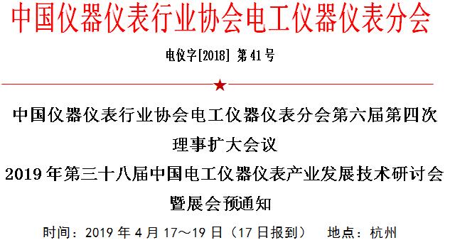 中國儀器儀表行業(yè)協(xié)會電工儀器儀表分會定于 2019 年4月在杭州召開“2019 第三十八屆中國電工儀器儀表產(chǎn)業(yè)發(fā)展技術(shù)研討會暨展會”,同期召開“中國儀器儀表行業(yè)協(xié)會電工儀器儀表分會第六屆第四次理事擴大會議”。