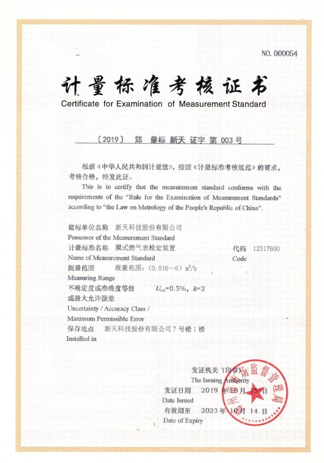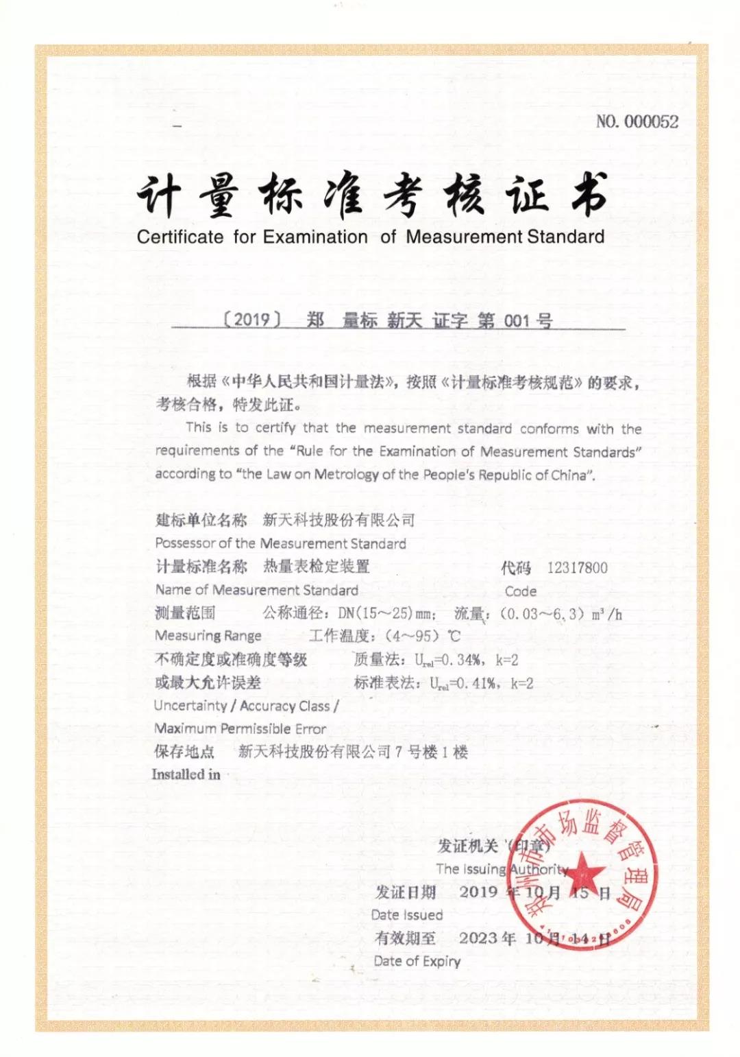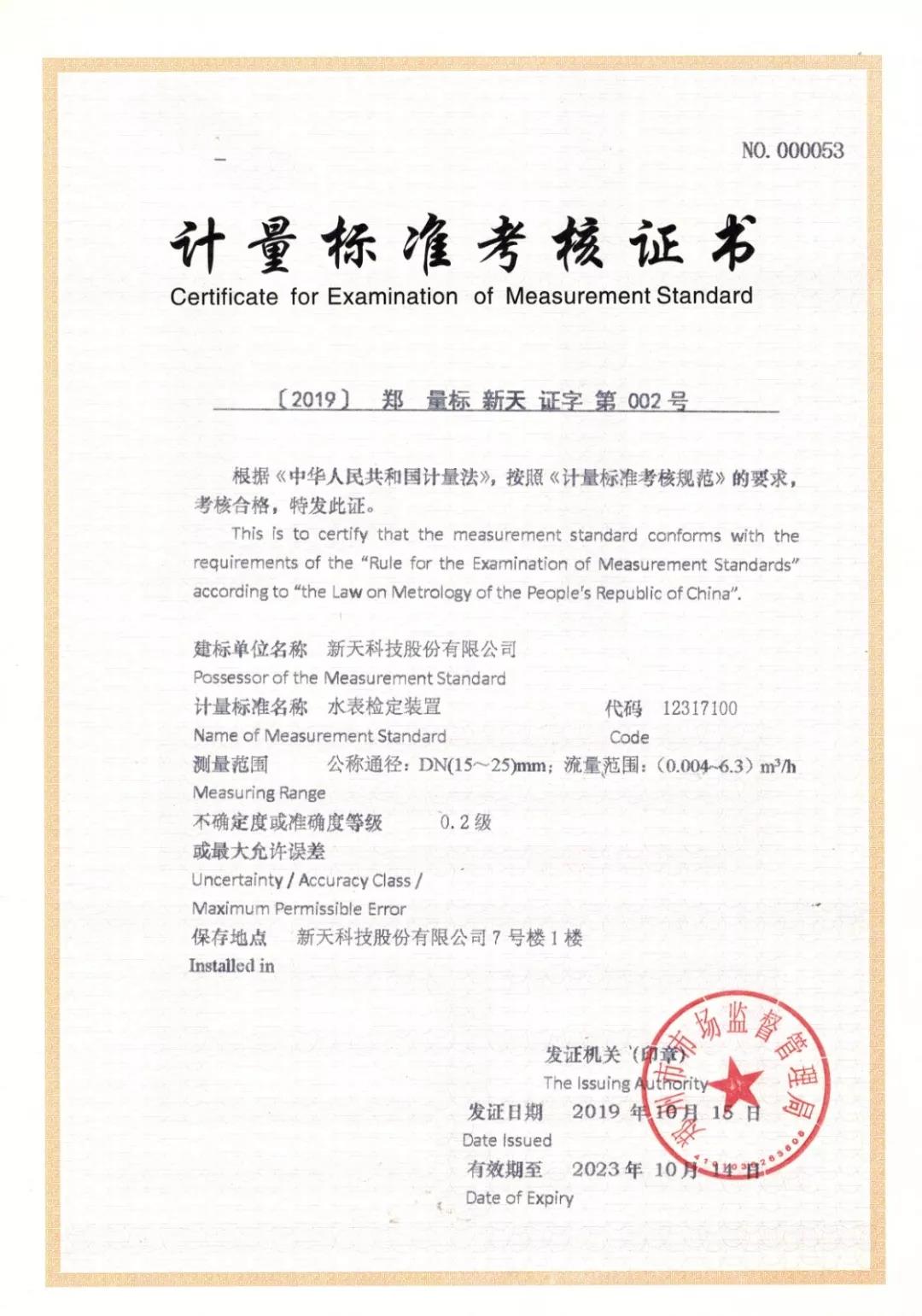 2019年10月,經(jīng)過市市場監(jiān)管局批準、省計量院專家考核,新天科技成功取得水表、燃氣表、熱量表計量標準考核證書,建立了一套完整的按《JJF1033-2016計量標準考核辦法》實施的計量標準管理體系。