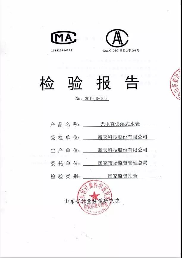 2019年10月,新天科技水表產品再次順利通過國家市場監督管理總局質量監督抽查,榮獲國家《檢驗報告》合格證書。