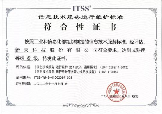 2019年10月22日至10月31日,中國(guó)電子工業(yè)標(biāo)準(zhǔn)化技術(shù)協(xié)會(huì)信息技術(shù)服務(wù)分會(huì)(ITSS分會(huì))組織召開(kāi)了《信息技術(shù)服務(wù) 運(yùn)行維護(hù)服務(wù)能力成熟度模型》(以下稱運(yùn)行維護(hù)服務(wù)能力成熟度)符合性評(píng)估專(zhuān)家評(píng)審會(huì)。根據(jù)專(zhuān)家評(píng)審會(huì)評(píng)審結(jié)果,ITSS分會(huì)于2019年11月1日至11月7日對(duì)擬授予符合性證書(shū)的單位名單進(jìn)行了公示,根據(jù)公示結(jié)果及反饋意見(jiàn)對(duì)通過(guò)符合性評(píng)估的單位名單進(jìn)行了最終確認(rèn)。按照工業(yè)和信息化部組織制定的信息技術(shù)服務(wù)標(biāo)準(zhǔn),經(jīng)評(píng)估,新天科技股份有限公司符合要求達(dá)到成熟度等級(jí)叁級(jí),獲得“ITSS信息技術(shù)服務(wù)運(yùn)行維護(hù)標(biāo)準(zhǔn)符合性證書(shū)”。