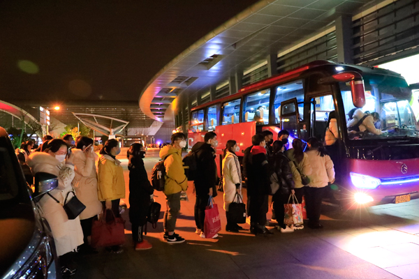 同時,公司還組織了由8輛大巴車組成的車隊,對這批特殊乘客進行專車接送,在上車前對所有人員進行體溫測量和消毒,并為員工安排了住宿點,進行必要的觀察休整,實現了由城點到站點、站點到廠點的三點無縫連接。