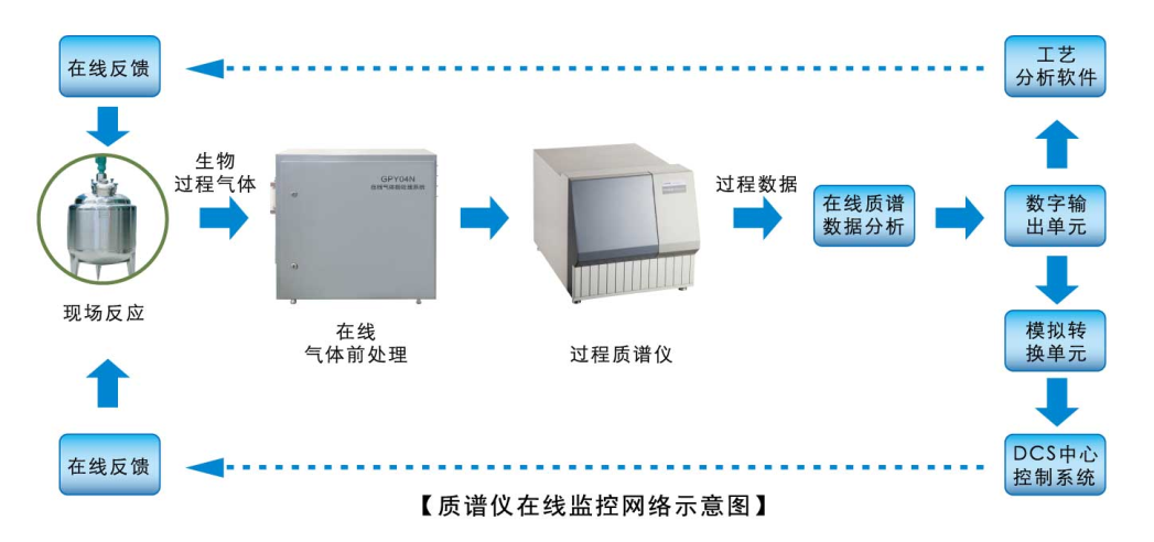 在線質譜儀是在線、快速、多組分氣體成分高精度分析儀器,將在線質譜儀用于生物過程領域,實現不同類型生物過程尾氣中 O2、CO2、N2、H2、乙醇、CO、Ar等氣體及其它可揮發分子組分的高精度、寬量程和長時間連續穩定測量,得到氣體的種類(性質)和濃度變化等信息 ,并將數據輸入軟件或者 D CS 控制系統進行相關計算并實施連鎖控制。