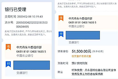 2月8日上午,丹東百特黨支部將凝聚著33名黨員和136名員工拳拳愛國之心的51500元的特殊黨費匯到中共丹東市委組織部。市委組織部領(lǐng)導(dǎo)稱贊百特是“愛黨愛國的典范,抗擊疫情的榜樣”。