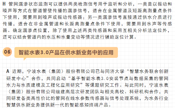 最近,寧水集團已正式啟動新一代智能水表(智能水表3.0)產品及供水新業務系統的商用化研發工作,在原先公司多個博士后課題研究基礎上進行商品化與工程化應用研究。可以預期,在不遠將來公司將為供水管網系統提供高性價比的水務綜合大數據,為管網現代化管理提供信息來源與決策依據(這方面詳細內容可參見附錄:“水表產品演進之路——從智能水表1.0/2.0產品向智能水表3.0產品邁進”一文)。至2020年初,公司在與浙江大學控制科學與工程學院合作基礎上,又先后與同濟大學環境科學與工程學院、寧波大學信息科學與工程學院等高校共同簽訂戰略合作協議,并聯合成立了“水務新技術研發實驗室”和“水務信息感知研發實驗室”,并將與寧波工業互聯網研究院等科研機構就水務新型傳感技術、供水關鍵核心業務等的解決方案展開合作研究。