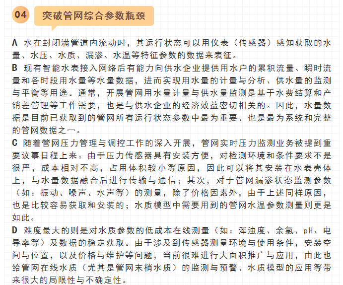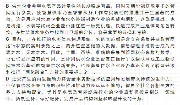 寧水集團2019年初在主板A股上市后,進一步確立了服務于智慧供水新業務的戰略方針與目標,在持續做好水表產品水計量性能提升、以NB-IoT5G技術等為代表的無線數據遠傳業務拓展以及DMA分區計量漏損監測、水務信息化應用等工作基礎上,正在努力向供水管網數據綜合提供商和智慧供水核心業務服務商轉型與升級,其近中期目標是向供水企業提供在線一體化的高性價比管網綜合大數據感知裝置(包括:水量、水壓、水質、漏滲、水溫等參數),為智慧供水新業務及水務信息化云平臺提供海量數據支撐,使現有水力、水質、漏損、能耗等水務管網模型運行準確度能夠顯著提升。