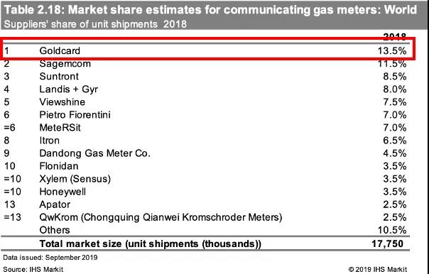 金卡智能已步入全球物聯(lián)網(wǎng)表計第一方陣。據(jù)HIS Markit統(tǒng)計,金卡智能燃氣終端全球市場占有率排名第一。