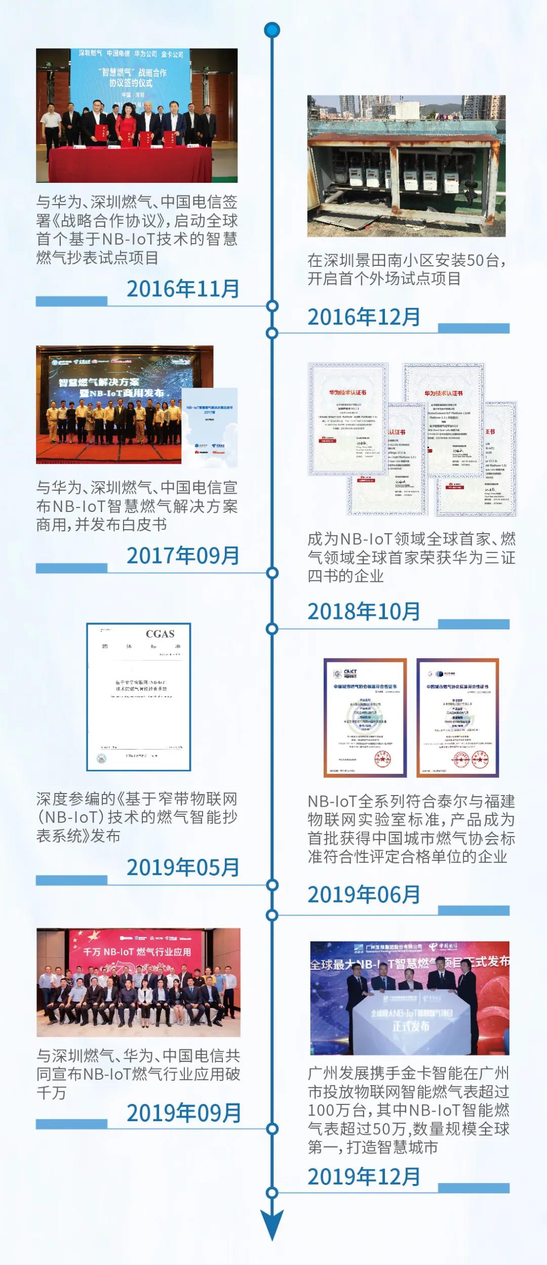 NB-IoT技術(shù)作為5G分支之一,成為推動行業(yè)數(shù)字化轉(zhuǎn)型利器。金卡智能從技術(shù)研發(fā)、標準制定、市場推動、生態(tài)建設等方面積極促進NB-IoT技術(shù)在燃氣行業(yè)的應用。2016年7月,第一臺NB-IoT智能燃氣表在華為實驗室完成測試,隨著基于NB-IoT技術(shù)在燃氣行業(yè)生態(tài)建設不斷深入,NB-IoT智慧燃氣解決方案在國內(nèi)外得以廣泛部署。