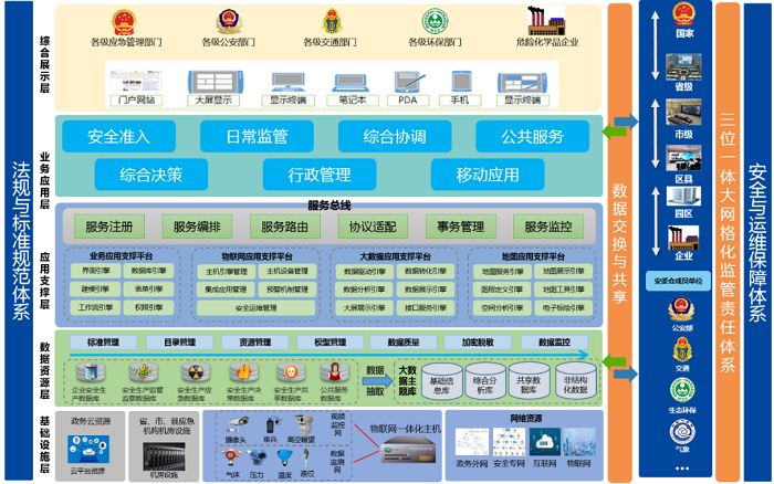 平臺總體框架自下而上分別為基礎(chǔ)設(shè)施層、數(shù)據(jù)資源層、應(yīng)用支撐層、業(yè)務(wù)應(yīng)用層和綜合展現(xiàn)層,以及兩翼的法規(guī)與標準規(guī)范體系、“三位一體”大網(wǎng)格化監(jiān)管責任體系、安全與運維保障體系(簡稱“五層三體系”)。