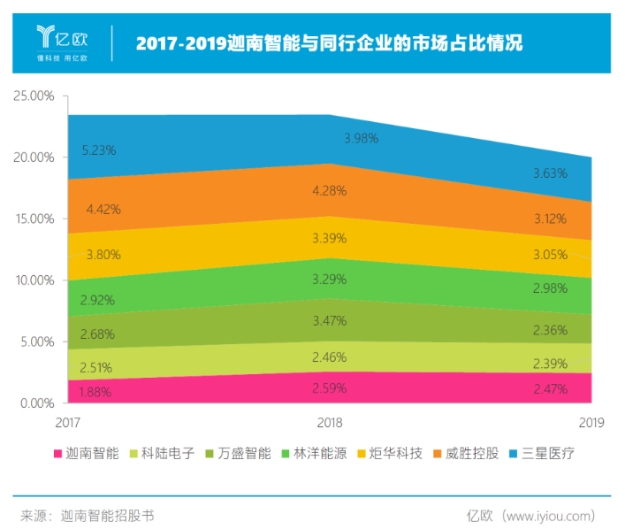 迦南智能不足3%的市場份額的確不高,但它與同行公司相比差距并不大。在上市企業中,炬華科技(300360)、威勝控股(03393.HK)、三星醫療(601567)的市場占有率連續三年超過了3%,但其市占率的成績并不喜人。2017-2019年,這三家企業市占率連年走低。