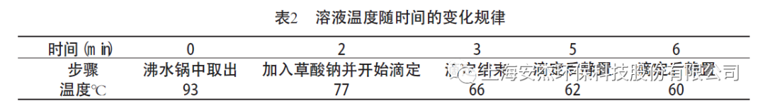 從沸水浴中取出錐形瓶時(shí)的溫度可達(dá)93℃,但加入草酸鈉溫度下降了16℃;滴定過程只用了1min, 溫度卻又下降了11℃,達(dá)到66℃。與反應(yīng)溫度下限只差6℃;滴定結(jié)束后在放置3min,溫度降至60℃。由此可見,滴定過程必須自加熱結(jié)束起快速進(jìn)行,爭(zhēng)取在3min 內(nèi)結(jié)束滴定,不能超過6 min。