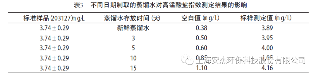 標(biāo)樣測(cè)定值隨著空白值的增大而增大,當(dāng)空白值為0.60 mg/ L (即蒸餾水存放時(shí)間為5 天)時(shí),測(cè)定結(jié)果已接近不確定度的上限,而空白值超過0.85 mg/ L (即蒸餾水存放時(shí)間超過10 天)時(shí),測(cè)定結(jié)果已超出不確定度的上限。因此,在測(cè)定高錳酸鹽指數(shù)時(shí),不要使用存放時(shí)間超過5 天的蒸餾水,最好取用新鮮蒸餾水,這樣就可以減少空白值對(duì)測(cè)定結(jié)果的影響。