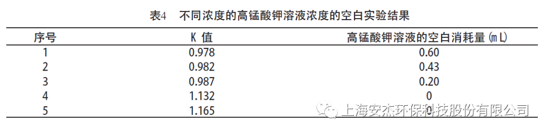 當(dāng)K值較小即高錳酸鉀溶液濃度過低時(shí),空白消耗量偏大,使測(cè)定結(jié)果偏低;當(dāng)K 值較大即高錳酸鉀溶液濃度大于0.0100 mol/L時(shí),空白消耗量為0 mL,空白實(shí)驗(yàn)無法完成。所以在測(cè)定樣品前首先要將高錳酸鉀溶液濃度調(diào)至≤0.0100 mol/L,越接近理論值越好。