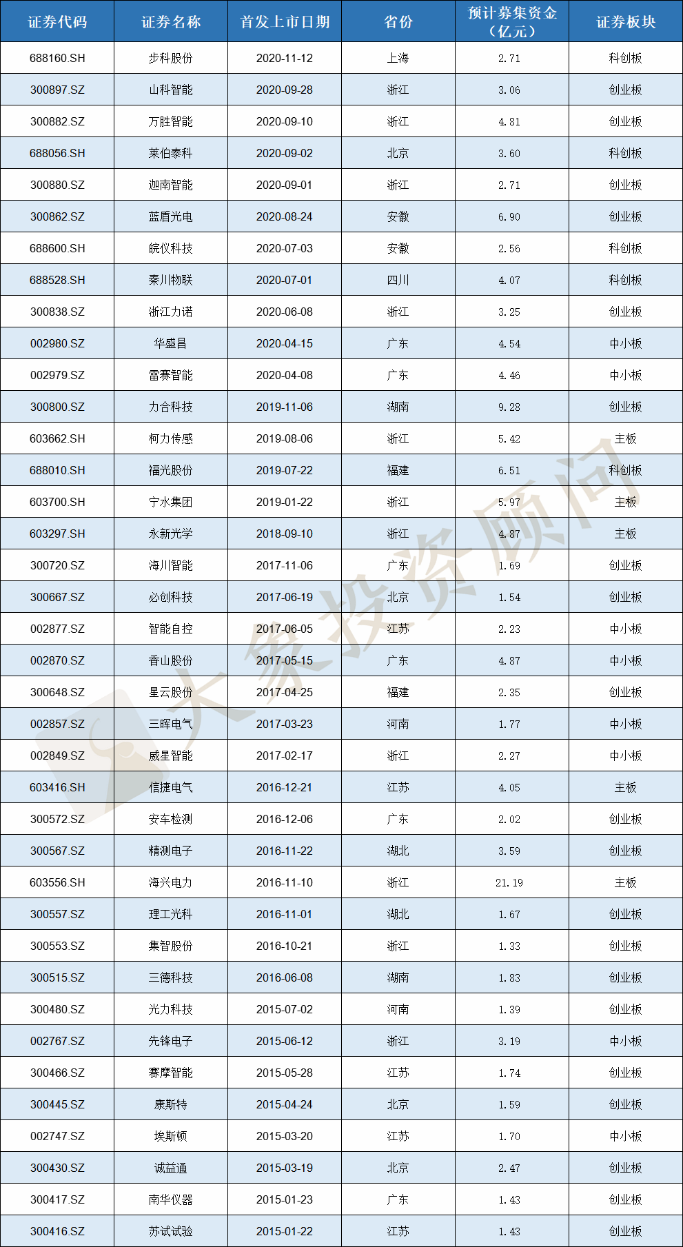 從2015-2020年IPO新上市企業(yè)名單來(lái)看(數(shù)據(jù)截至2020年12月15日),這期間在A股新上市的企業(yè)共有1560家,其中儀器儀表制造業(yè)的企業(yè)有38家,占總審核的2.43%。