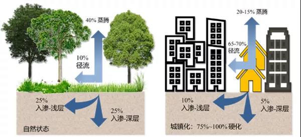 城市是人口高度聚集、社會經(jīng)濟(jì)也高度發(fā)達(dá)的地區(qū),是資源環(huán)境承載力矛盾最為突出的地方。改革開放以來,我國進(jìn)入了城鎮(zhèn)化快速發(fā)展階段,城鎮(zhèn)化率從1979年的不到20%,發(fā)展到當(dāng)今的60%左右,年均增幅接近1%。在傳統(tǒng)城市建設(shè)理念的影響下,城市開發(fā)建設(shè)帶來的城市下墊面過度硬化,城市的“地穿甲”割裂了山水林田湖草的生態(tài)系統(tǒng),改變了原有的自然生態(tài)本底和水文特征,切斷了水的自然循環(huán)過程,破壞了城市水文徑流特征的原真性(見圖1);同時,城市建設(shè)高強(qiáng)度開發(fā)、填湖(塘)造地、伐林減綠,忽略或任意調(diào)整豎向關(guān)系等粗放做法,在加快降水產(chǎn)匯流的同時,也加大了降雨徑流量和匯流峰值。