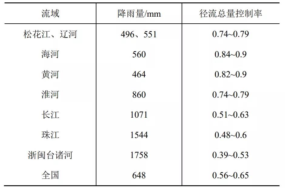海綿城市建設(shè)是基于對自然本底的保護(hù)與修復(fù),因此確定徑流總量控制率時必須要掌握城市所在地的降雨自然徑流規(guī)律與特點,依此來確定。當(dāng)?shù)氐淖匀粡搅饕?guī)律和特點與降雨量、下墊面狀況、土壤滲透性以及地下水位等因素有關(guān),可通過多年降雨形成產(chǎn)匯流的水文統(tǒng)計數(shù)據(jù)推導(dǎo)得出。在海綿城市建設(shè)初期推廣時,住建部印發(fā)的《海綿城市建設(shè)技術(shù)指南》中給出了北京建筑大學(xué)研究團(tuán)隊收集國內(nèi)200多個城市降雨資料統(tǒng)計計算繪制的參考圖,供當(dāng)時試點城市和各地在確定徑流總量控制率時參考。筆者根據(jù)水利部水文局1986年《中國水資源評價》統(tǒng)計數(shù)據(jù)計算的徑流總量控制率見表2,地處流域中上游的城市可取上限值、下游城市可取下限值。