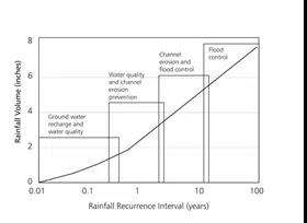 年徑流總量控制率主要是針對中小降雨事件,可依據(jù)多年降雨資料導(dǎo)出降雨徑流總量控制率與降雨量的對應(yīng)關(guān)系,其統(tǒng)計計算方法可參考《海綿城市建設(shè)技術(shù)指南》或《海綿城市建設(shè)評價標(biāo)準(zhǔn)》(GB/T51345-2018)。依徑流總量控制率確定的設(shè)計降雨水深與徑流控制設(shè)施的服務(wù)范圍設(shè)計降雨徑流控制設(shè)施的規(guī)模。年徑流總量控制率指標(biāo)應(yīng)該通過城市規(guī)劃分解到各個排水分區(qū)或開發(fā)建設(shè)的地塊上,再依據(jù)建設(shè)性詳規(guī)具體落實到實施項目上。