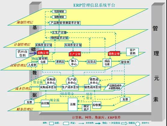 在圖1.(計算機、網絡、數據庫、ERP軟件)基礎設施、基礎數據、管理元素、專業管理(職位)層、計劃流程、業務流程都會通過ERP管理信息系統平臺(多維度的)互聯互動。一個有限的、有序的、合規的、直觀的、可行的企業信息化模型。