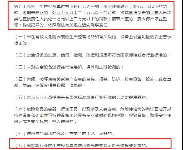 《中華人民共和國安全生產法》第九十九條還規定,餐飲等行業的生產經營單位使用燃氣未安裝可燃氣體報警裝置的,將進行相應處罰;情節嚴重的,責令停產停業整頓;構成犯罪的,依照刑法有關規定追究刑事責任。