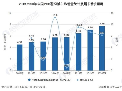 2013-2020年中國PCB覆銅板市場銷量統計及增長情況預測