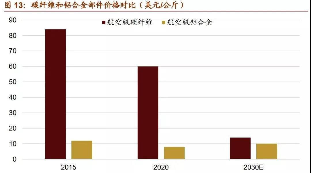此外,碳纖維在其他應用領域還有很大潛力可以挖掘。以主要競爭對手鋁合金為例,碳 纖維和鋁合金同屬替換鋼材的輕量化材料,碳纖維在強度、化學穩定性等性能上都占優, 并且在飛機部件、高性能汽車車架、自行車架等產品相比鋁合金都有更好的表現。但受 累于高昂的價格,目前碳纖維應用大多局限于高附加值產品。2016 年世界鋁材年需求 量約是碳纖維的 500-600 倍,行業產值約為 50 倍,且受益于汽車工業的發展鋁材需求 近年也在快速增長。隨著技術的進步壓低碳纖維的成本,未來碳纖維還有廣闊的市場空間。