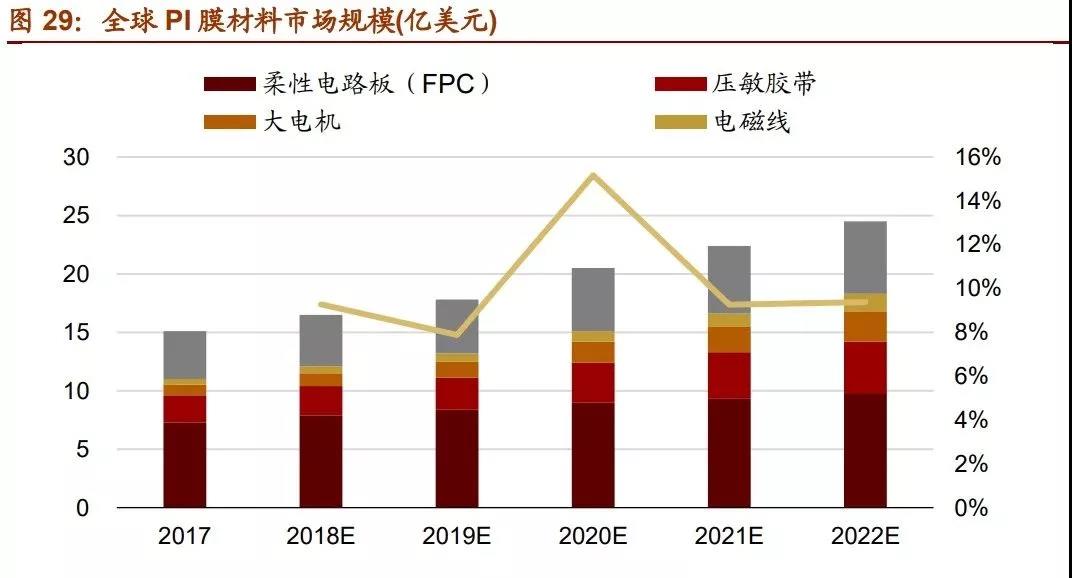 PI 薄膜是市場規模最大的聚酰亞胺細分領域。2010 年以來,智能手機、電子顯示、柔 性電路板等領域快速發展,驅動 PI 薄膜產業快速發展。在 5G 與消費電子創新周期的 驅動下,天線材料、電子元器件、柔性顯示等領域有望維持強勁的發展勢頭。另外,主 要國家在航空航天領域加大投入,將會拉動高性能特種 PI 膜的需求。
