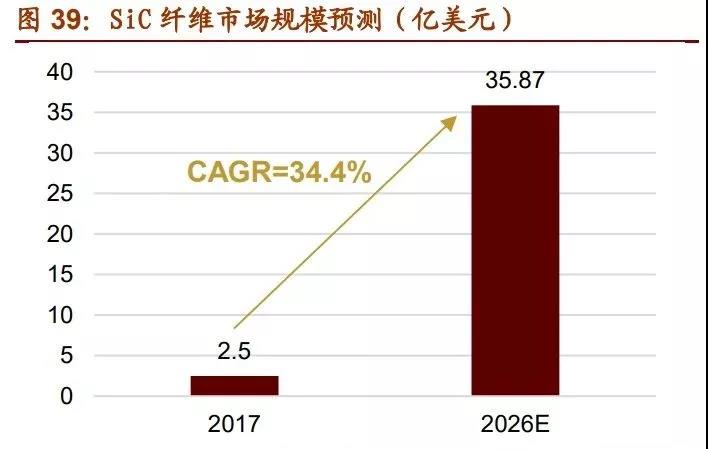 據不完全統計,2015 年全球連續碳化硅纖維的總產量達 300 噸。未來幾年,隨著美日 主要生產商進一步擴產,中國、中東生產商入局,預計世界碳化硅纖維總產量至 2025 年有望增長至 500 噸左右。根據 Stratistics MRC 預測,SiC 纖維市場 2017 年的估值為 2.5 億美元左右。隨著 SiC 纖維的研究工作不斷深入、使用場景逐步增加,其市場需求 有望快速擴大。預計到 2026 SiC 纖維的市場規模將增長至 35.87 億美元,復合年增 長率將達到 34.4%