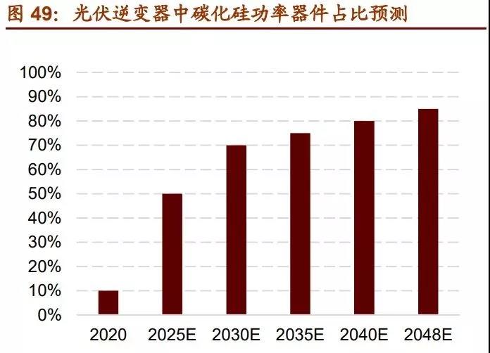 4)智能電網:固態變壓器、 柔性交流輸電、柔性直流輸電、高壓直流輸電及配電系統。隨著碳化硅功率器件的進一步發展,其在各個領域的滲透率不斷提高,據 Yole,全球車載 SiC 功率器件的市場空間 為預計到 2024 年可以達到 19.3 億美金,對應 2018-2024 年復合增速達到 29%。據天 科合達招股說明書預測,碳化硅功率器件在光伏逆變器中的占比在2025年將達到50%, 軌道交通中碳化硅器件應用占比也將逐步上升。