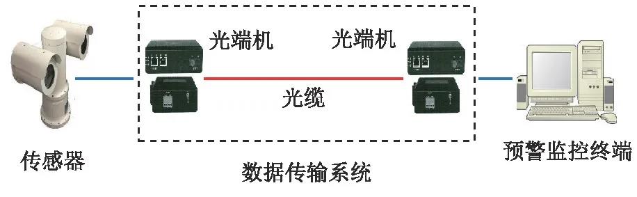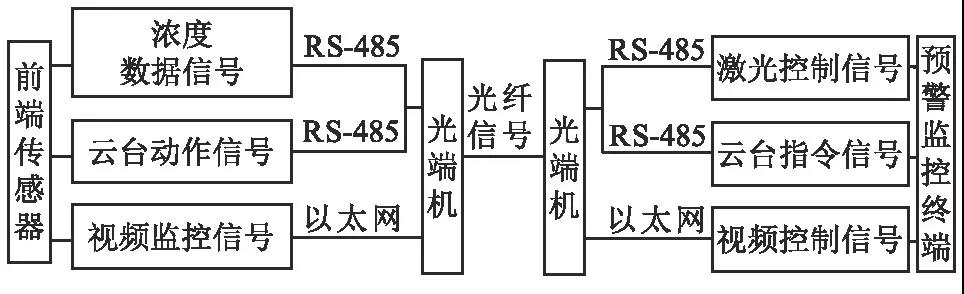 數(shù)據(jù)傳輸系統(tǒng)負(fù)責(zé)前端激光氣體傳感器與后端預(yù)警監(jiān)控終端之間信號的傳輸。其中前端傳感器向后端傳輸?shù)男盘枮椋杭す鈾z測模塊的濃度數(shù)據(jù)信號;三維旋轉(zhuǎn)云臺實(shí)時返回的云臺動作信號;視頻監(jiān)控模塊采集的工藝現(xiàn)場視頻信號。預(yù)警監(jiān)控終端通過向前端傳感器發(fā)送指令信號控制傳感器的運(yùn)行。