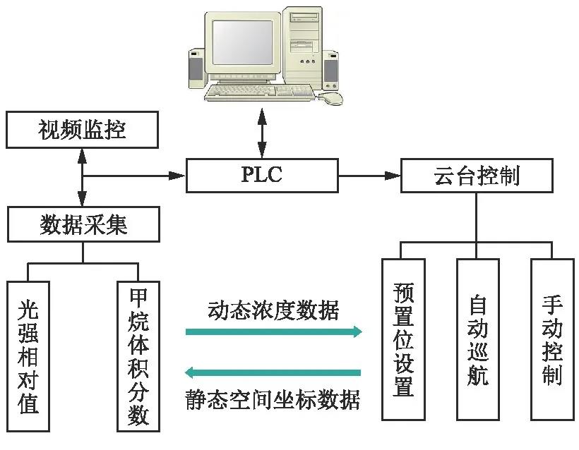 系統(tǒng)監(jiān)控終端軟件平臺基于力控組態(tài)軟件與可編程邏輯控制器進(jìn)行開發(fā),其上位機(jī)監(jiān)控軟件采用力控ForceControl7.2組態(tài)軟件進(jìn)行搭建,下位機(jī)系統(tǒng)軟件采用PLC編程軟件實(shí)現(xiàn),通過上位機(jī)與下位機(jī)之間的通信連接可實(shí)現(xiàn)對激光氣體傳感器的運(yùn)行控制以及對天然氣站場天然氣泄漏的實(shí)時監(jiān)測。根據(jù)天然氣站場可燃?xì)怏w監(jiān)測的需求,系統(tǒng)中設(shè)有云臺控制、視頻監(jiān)控、數(shù)據(jù)采集三大模塊。