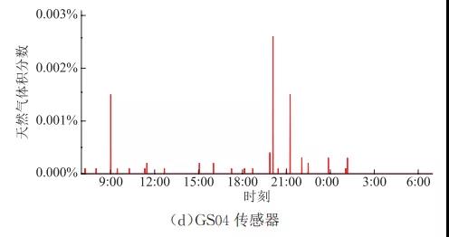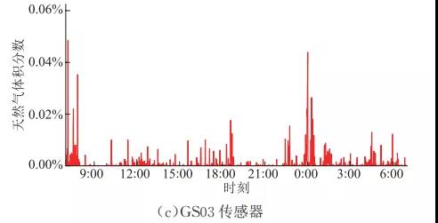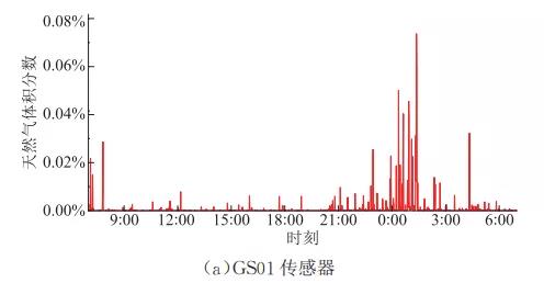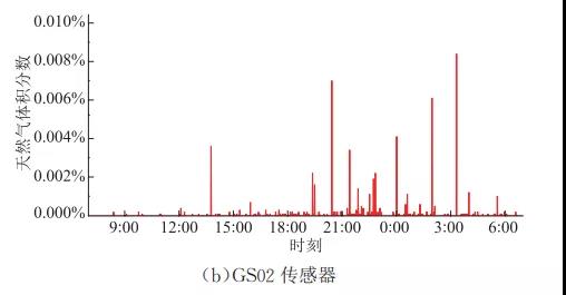 對傳感器運(yùn)行參數(shù)設(shè)置完成后,選取系統(tǒng)運(yùn)行一日的監(jiān)測數(shù)據(jù),分析可知:過濾區(qū)與空冷區(qū)管道設(shè)備種類繁多,包括大量閥門、法蘭等部件,且負(fù)責(zé)大輸送量的天然氣過濾與冷卻等工藝,其在日常的運(yùn)行中存在微量泄漏,天然氣體積分?jǐn)?shù)一般處于200×10-6以下,遠(yuǎn)低于爆炸極限,處于安全水平。此外,該工藝區(qū)在7:00與0:00均監(jiān)測到較高的天然氣泄漏,此現(xiàn)象與該時間段輸氣壓力較高有關(guān)。而增壓區(qū)的設(shè)備主要是輸氣管道,工藝較為簡單,因此存在的微泄漏現(xiàn)象相比過濾區(qū)與冷卻區(qū)輕微,天然氣體積分?jǐn)?shù)多集中在100×10-6下。以上監(jiān)測結(jié)果符合壓氣站實(shí)際情況,說明該系統(tǒng)具有較好的準(zhǔn)確性與實(shí)用性。