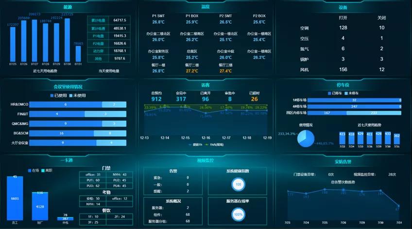 智慧工廠要求對園區(qū)的視頻監(jiān)控、安防報警、人員巡查、門禁考勤、訪客管理、一卡通管理、停車位、會議室、信息發(fā)布、能源使用情況、環(huán)境變化、設備參數等工作進行實時在線的統(tǒng)一管理,企業(yè)可利用傳感器技術實現動態(tài)捕捉、熱成像報警、人臉識別、溫濕度感應等,再利用OA或報表系統(tǒng)實現在線巡檢、信息發(fā)布、會議室線上預約、訪客線上登記等,將系統(tǒng)數據和傳感器數據利用微服務接口的方式進行調用,形成園區(qū)全貌管理指標,最后利用3D建模技術開發(fā)智慧園區(qū)全局管理模型或利用數據分析工具制作園區(qū)綜合管理駕駛艙,實現對園區(qū)資源的統(tǒng)一高效管理,打造綠色、高效、安全的智慧園區(qū)。