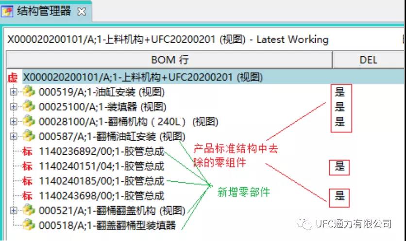 在圖9的變型設計BOM中描述產品變形的內容,其中定義了為訂單新增、減少的零部件。對于Teamcenter注釋“DEL”為“是”的BOM行,為變形設計中從標準產品配置中去除的零部件,默認沒有值的BOM行為為訂單新增的零部件。通過該方法,既考慮了產品選配的模塊化設計方法,最大程度使用已有設計成果,又兼顧了訂單變形設計的實際需要。