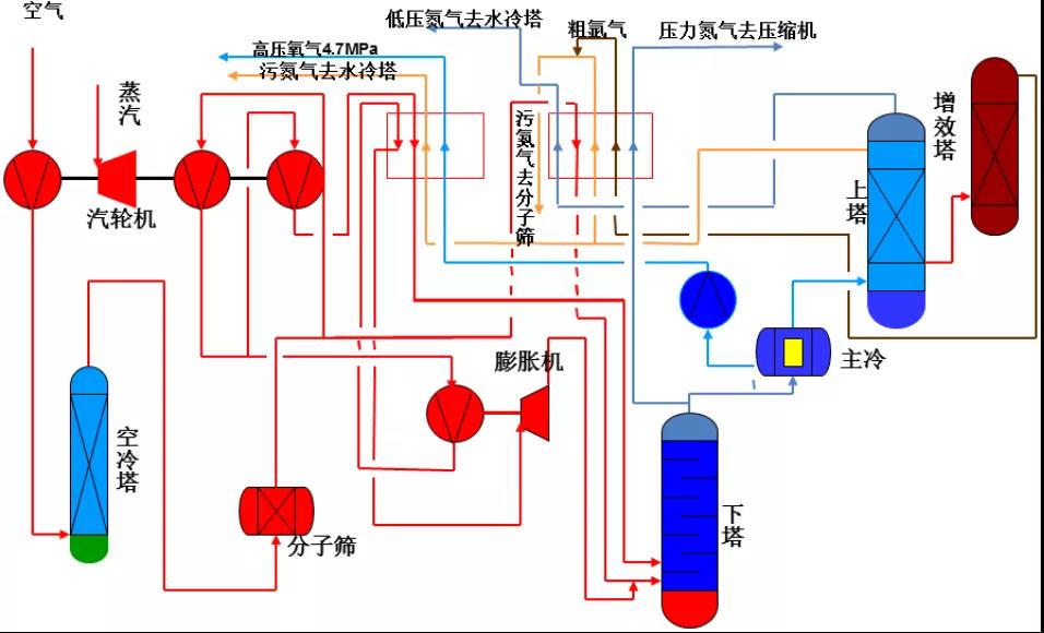 原料空氣壓縮機和增壓空氣壓縮機采用離心式或軸流式壓縮機,由透平蒸汽輪機驅動。原料空氣壓縮機的作用是為裝置提供帶壓原料氣,增壓空氣壓縮機的作用是為裝置提供膨脹及液氧氣化的氣源。