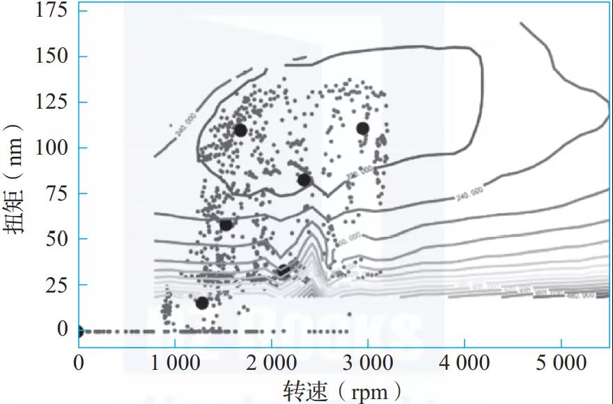圖2-11中頂部圈定的區(qū)域是試驗(yàn)標(biāo)定的最優(yōu)油耗區(qū),圖中的點(diǎn)是用戶(hù)駕駛行為的油耗區(qū)。根據(jù)大數(shù)據(jù)分析,就可以調(diào)整發(fā)動(dòng)機(jī)管控參數(shù),實(shí)現(xiàn)面向?qū)嶋H用戶(hù)駕駛的最優(yōu)油耗。