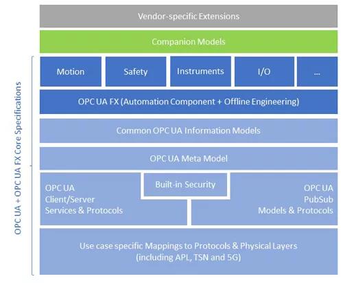 伙伴規范 OPC UA設計了一種可擴展的框架,通過OPC元模型-通用基礎信息模型-伙伴信息模型的結構,來支持廣泛的應用領域:從現場級別(例如測量或識別設備、PLC)到企業管理級別和離線工程設計級別。各個細分行業和不同領域在基礎信息模型規則的基礎上設計面向自身的行業和領域的行規模型。這些伙伴規范由廣泛的行業組織創建,他們專注于工程化并為多供應商互操作性提供公共語義模型的應用。OPC基金會有三種創建伙伴規范的方式,即由OPC內部工作組創建的模型,它們與統一架構規范相關聯;聯合伙伴模型,這些模型由OPC基金會和另一個組間的聯合工作組創建(如與PLCopen合作的IEC 61131-3的OPC UA信息模型,與ISA OMAC合作的PackML的OPC UA信息模型等);以及由獨立于OPC基金會的外部機構創建伙伴模型。