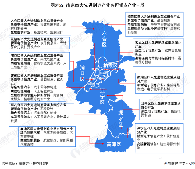 在四大先進制造產業區域布局上,南京各區域協同發展,中心城區如鼓樓區、玄武區由于城區空間資源有限,重點發展先進制造業相關設計、研發等附加值高端的關鍵環節,并依托新興電子信息產業技術開拓虛擬園區、優化區域空間布局。江北新區與南部新城則利用空間優勢,引入重點產業項目帶動區域內產業協同發展,各區域先進制造產業具體布局情況如下: