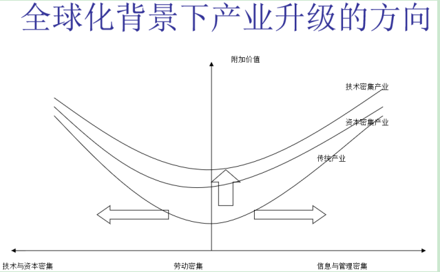 這條三條線代表不同的產(chǎn)業(yè),最低的是傳統(tǒng)產(chǎn)業(yè),往上是資本密集產(chǎn)業(yè)、技術(shù)密集產(chǎn)業(yè)。在同等價格環(huán)節(jié)上,它們都會有一個升級的過程。縱向是傳統(tǒng)產(chǎn)業(yè)升級,叫產(chǎn)業(yè)間的升級。因為有了全球價值鏈,一個國家的升級有了兩個新的方向,在微笑曲線向兩端升級,就是從低附加價值環(huán)節(jié)向上游研發(fā)和復(fù)雜零部件生產(chǎn)升級,以及向下游去做服務(wù)、做品牌。在新的全球化背景下,一個國家的升級有了三個方向,既有傳統(tǒng)的產(chǎn)業(yè)間升級,同時又有了價值鏈的升級。這是我們討論全球價值鏈帶來的一個很重要的新思路。