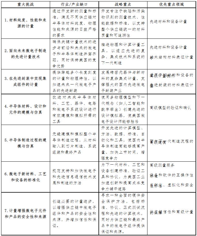 2022年9月的《美國半導(dǎo)體行業(yè)的戰(zhàn)略機(jī)遇》報(bào)告中,確定了從計(jì)量學(xué)角度需要重點(diǎn)關(guān)注的7大挑戰(zhàn),以實(shí)現(xiàn)美國領(lǐng)導(dǎo)的全球半導(dǎo)體行業(yè)的未來國家愿景。到2022年11月,芯片研發(fā)計(jì)量計(jì)劃將其投資組合進(jìn)一步細(xì)化為10個優(yōu)先重點(diǎn)領(lǐng)域,以解決最關(guān)鍵的計(jì)量研發(fā)缺口。七大挑戰(zhàn)及對應(yīng)優(yōu)先重點(diǎn)領(lǐng)域如下: