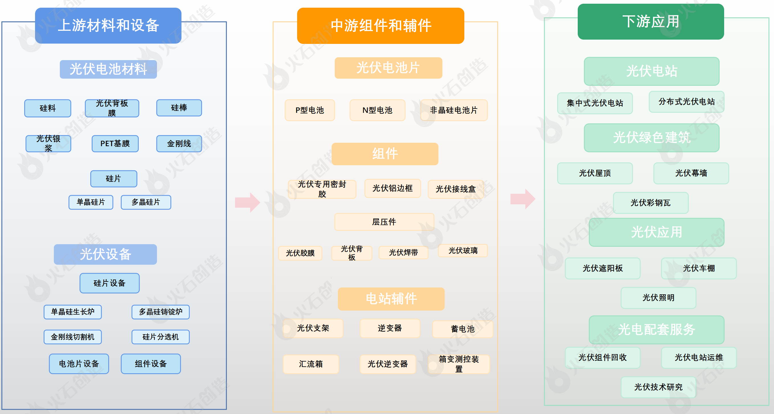 從光伏產(chǎn)業(yè)鏈看,上游包括硅料、硅片、PET基膜等光伏電池材料,以及硅片設(shè)備、電池片設(shè)備、組件設(shè)備等;中游包括光伏電池片、光伏組件、電站輔件等;下游包括光伏電站建設(shè)運營、光伏綠色建筑、光伏應用、光電配套服務等。