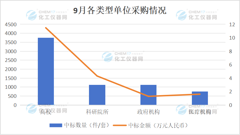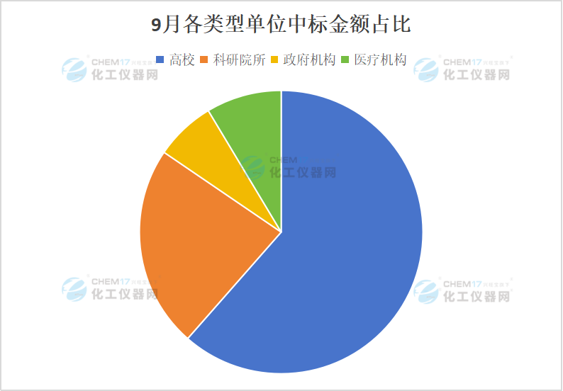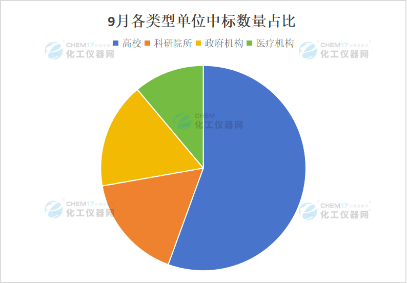 據(jù)化工儀器網(wǎng)不完全統(tǒng)計(jì),9月高校采購電鏡10套,采購金額為4305.26萬元,約占9月電鏡采購總金額的55.56%。從采購數(shù)量上看,科研院所和政府機(jī)構(gòu)的采購數(shù)量均為3套,約占9月電鏡采購總數(shù)量的16.67%