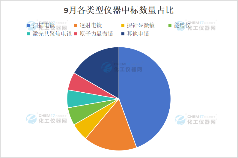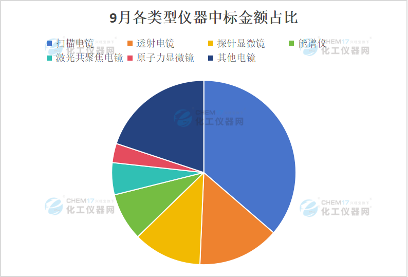 9月各類型儀器中標(biāo)數(shù)量占比”和“9月各類型儀器中標(biāo)金額占比”可以看出,掃描電鏡占據(jù)總中標(biāo)數(shù)量的44.44%,占據(jù)總中標(biāo)金額的36.32%;透射電鏡占據(jù)總中標(biāo)數(shù)量的16.67%,占據(jù)總中標(biāo)金額的14.35%