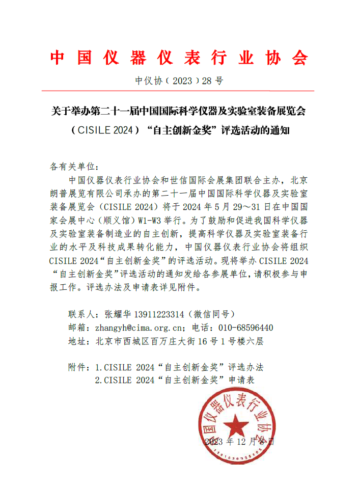 中國儀器儀表行業協會和世信國際會展集團聯合主辦,北京朗普展覽有限公司承辦的第二十一屆中國國際科學儀器及實驗室裝備展覽會(CISILE 2024)將于2024年5月29~31日在中國國家會展中心(順義館)W1-W3舉行。為了鼓勵和促進我國科學儀器及實驗室裝備制造業的自主創新,提高科學儀器及實驗室裝備行業的水平及科技成果轉化能力,中國儀器儀表行業協會將組織CISILE 2024“自主創新金獎”的評選活動。現將舉辦CISILE 2024“自主創新金獎”評選活動的通知發給各參展單位,請積極參與申報工作。評選辦法及申請表詳見附件。