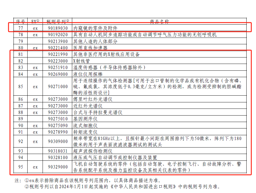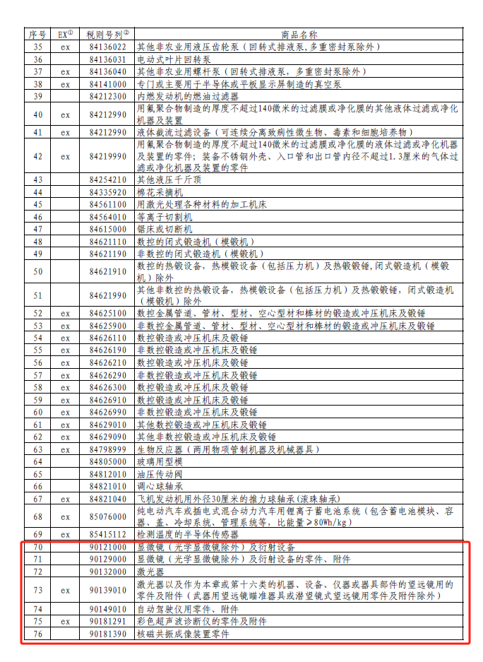 本次公布清單含顯微鏡(光學(xué)顯微鏡除外)及衍射設(shè)備;顯微鏡(光學(xué)顯微鏡除外)及衍射設(shè)備的零件、附件;激光器;激光器以及作為本章或第十六類的機(jī)器、設(shè)備、儀器或器具部件的望遠(yuǎn)鏡用的零件及附件(武器用望遠(yuǎn)鏡瞄準(zhǔn)器具或潛望鏡式望遠(yuǎn)鏡用零件及附件除外);自動駕駛儀用零件、附件;彩色超聲波診斷儀的零件及附件;核磁共振成像裝置零件;內(nèi)窺鏡的零件及附件;其他非醫(yī)療用的X射線應(yīng)用設(shè)備;X射線管;溫度傳感器(半導(dǎo)體傳感器除外);液位儀用探棒;用于連續(xù)操作的氣體檢測器[可用于出口管制的化學(xué)品或有機(jī)化合物(含有磷、硫、氟或氯,其濃度低于0.3毫克/立方米)的檢測,或?yàn)闄z測受抑制的膽堿酯酶的活性而設(shè)計(jì)];傅里葉紅外光譜儀;近紅外光譜儀;臺式與手持拉曼光譜儀;基因測序儀;流式細(xì)胞儀;轉(zhuǎn)矩流變儀;超聲波探傷檢測儀;液壓或氣壓自動調(diào)節(jié)或控制儀器及裝置;飛機(jī)自動駕駛系統(tǒng)的零件等儀器及零部件。
