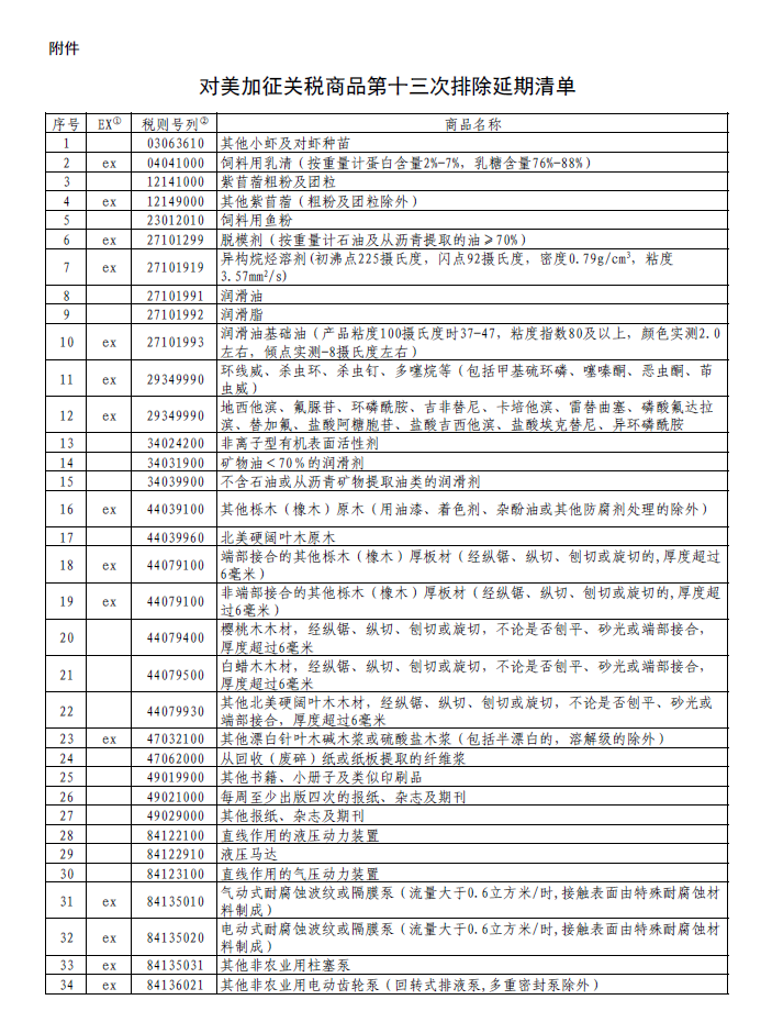 經(jīng)國務(wù)院批準(zhǔn),國務(wù)院關(guān)稅稅則委員會公布對美加征關(guān)稅商品第十三次排除延期清單,對《國務(wù)院關(guān)稅稅則委員會關(guān)于對美加征關(guān)稅商品第十一次排除延期清單的公告》(稅委會公告2023年第6號)中的相關(guān)商品,延長排除期限,自2024年1月1日至2024年7月31日,繼續(xù)不加征我為反制美301措施所加征的關(guān)稅。
