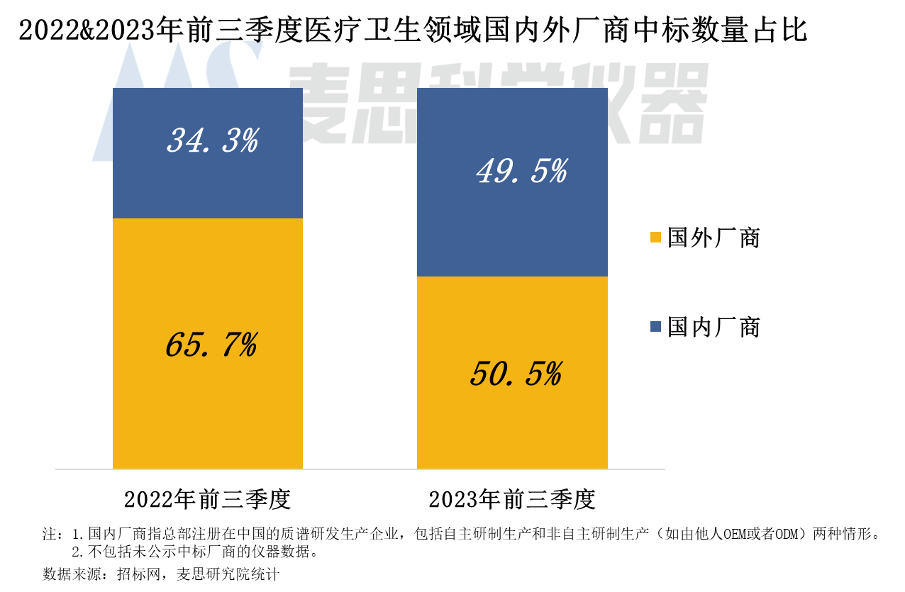 質譜儀器中標數量國產化率較高,與國外廠商中標數量占比僅有1個百分點的差距。與2022年同期對比,2023年前三季度國內廠商在醫療衛生領域的中標數量占比增長顯著,從34.3%增加至49.5%,增幅15個百分點。