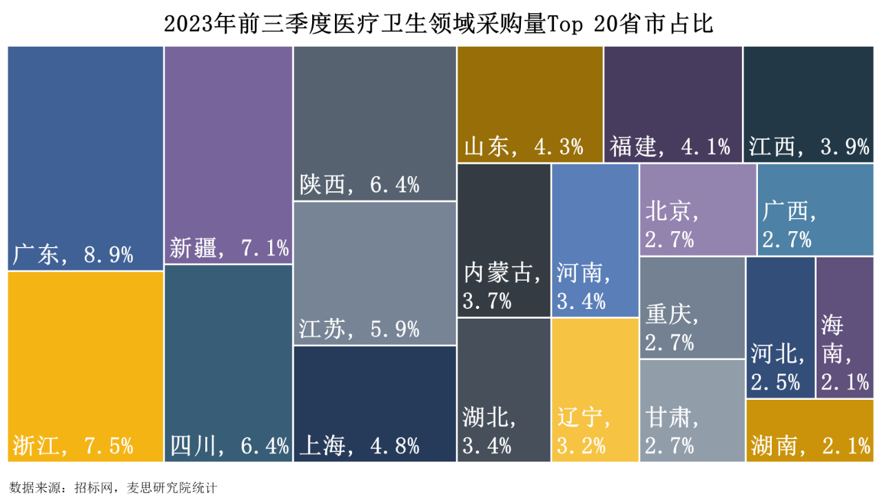 2023年前三季度,廣東、浙江、新疆、四川、陜西為醫療衛生域質譜儀器采購量的Top 5省份,中標數量占比合計36.3%