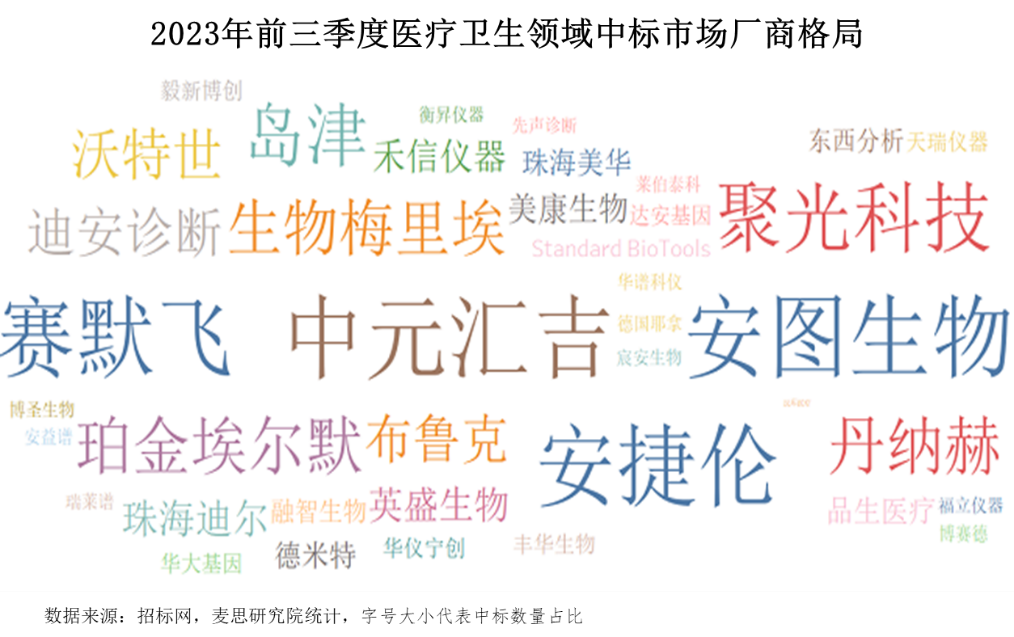 醫療衛生領域中標數量Top 5企業分別為中元匯吉、安圖生物、安捷倫、賽默飛、聚光科技。相較于其他領域,國內廠商在醫療衛生領域表現優異。