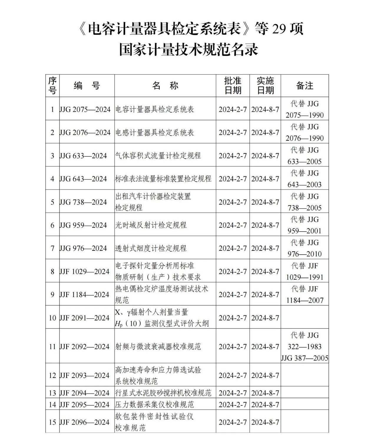 根據(jù)《中華人民共和國計量法》有關規(guī)定,批準《電容計量器具檢定系統(tǒng)表》等29項國家計量技術規(guī)范發(fā)布實施,現(xiàn)予公告。